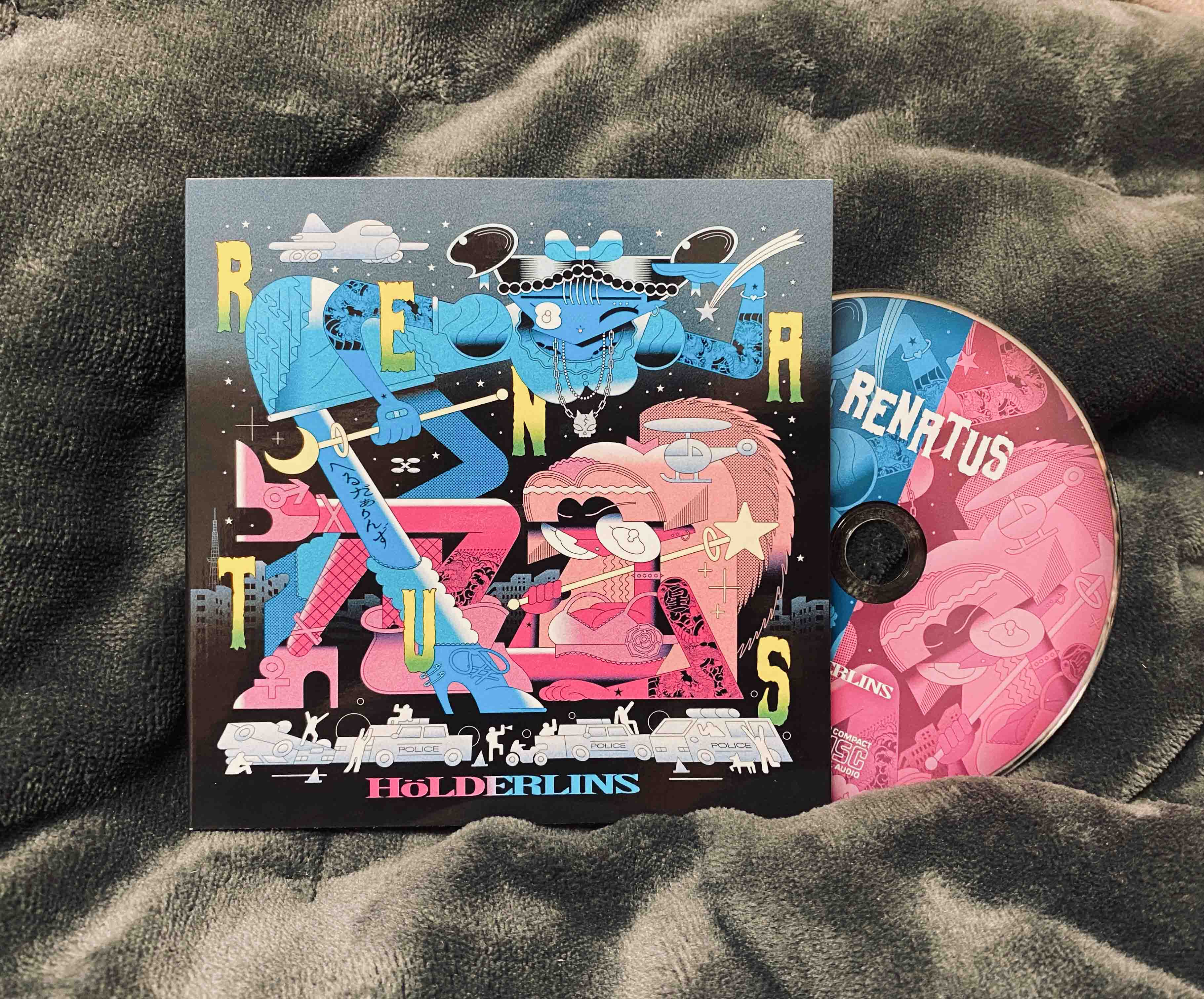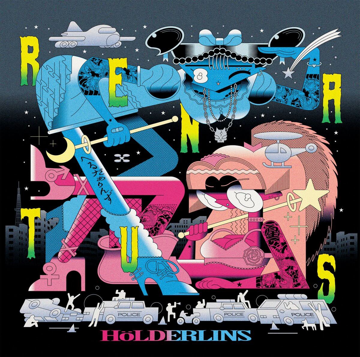 HöLDERLINSミニアルバム「RENATUS」CDジャケット / DEC 2021Vo.キラ☆アン、シャウトVo.なにぬねのん、Gt.TKG(たかじぃ)、Ba. で構成される東京を拠点に活動するバンド、HöLDERLINSのCDヴィジュアル。ボーカルが愛する、キキララをモチーフに、ロックな救世主ガールズを描きました。