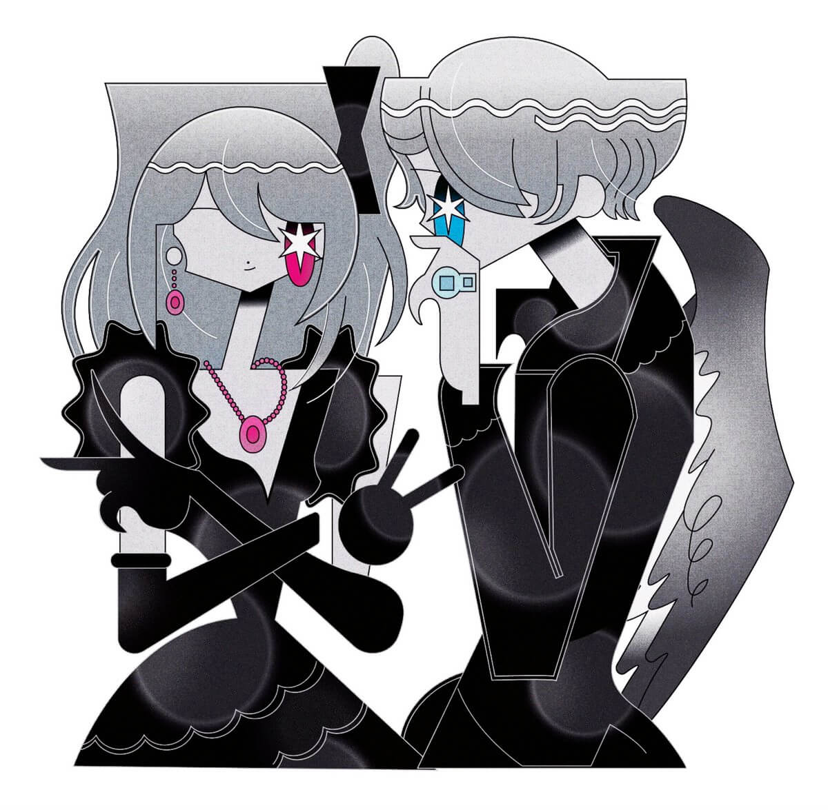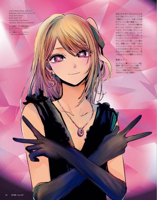 ファッション誌「SPUR」推しの子コラボ号背景アートワーク / JULY 2023ファッション誌「SPUR」の人気漫画「推しの子」コラボ号にて、背景グラフィックを担当させて頂きました。あくまで主役のキャラクター達を立てられるよう、宝石のような輝きと、対比としての陰りをさりげなく演出してみました。